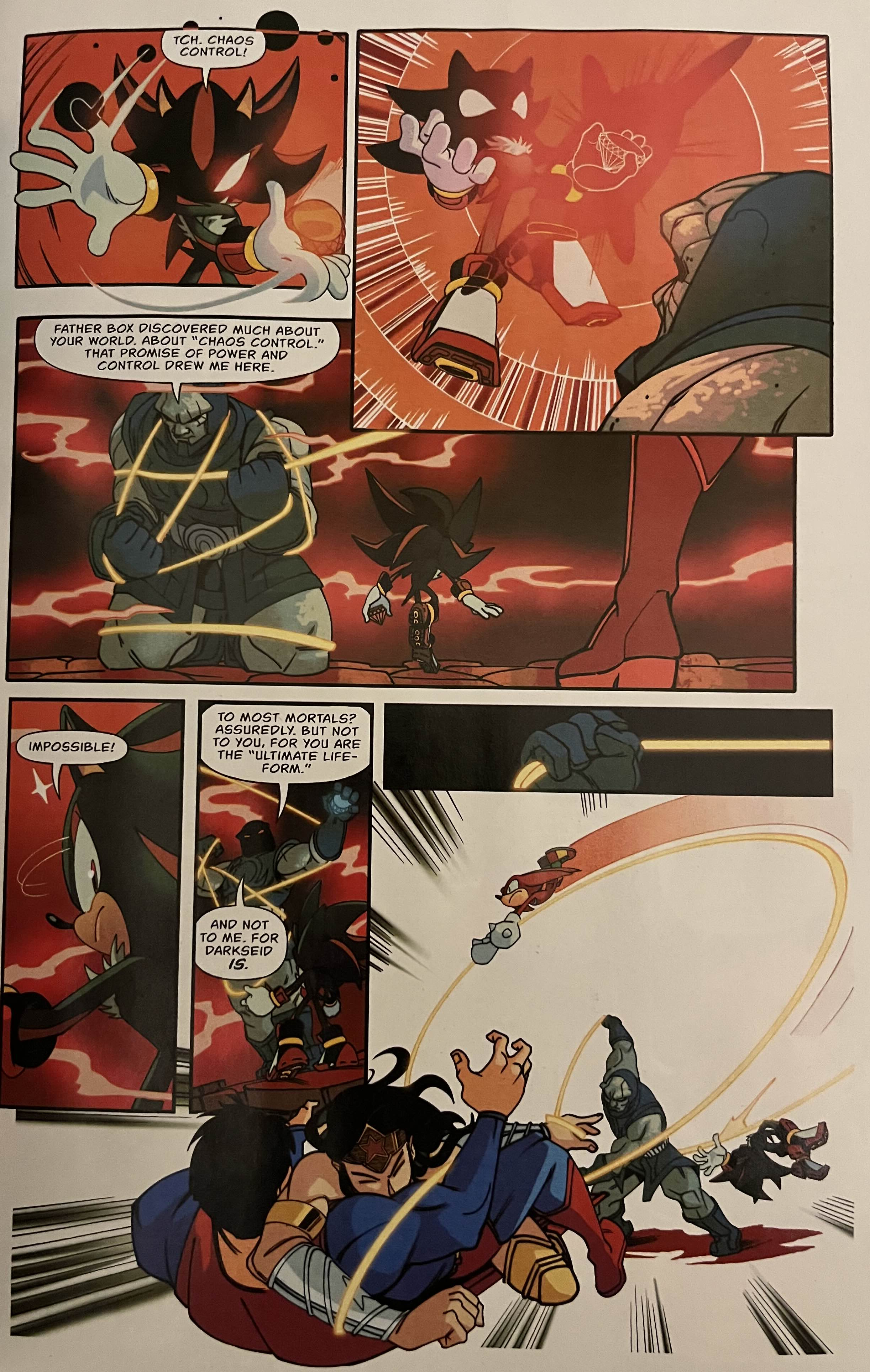 Shadow scoffs, using chaos control to freeze time, but while everything else freezes, Darkseid does not. Because Darkseid is. Here, we finally feel the weight of his presence, though I feel the art undersells it a little. Great art! But it could use framing that draws out this moment and exaggerated camera angles that give it more weight.