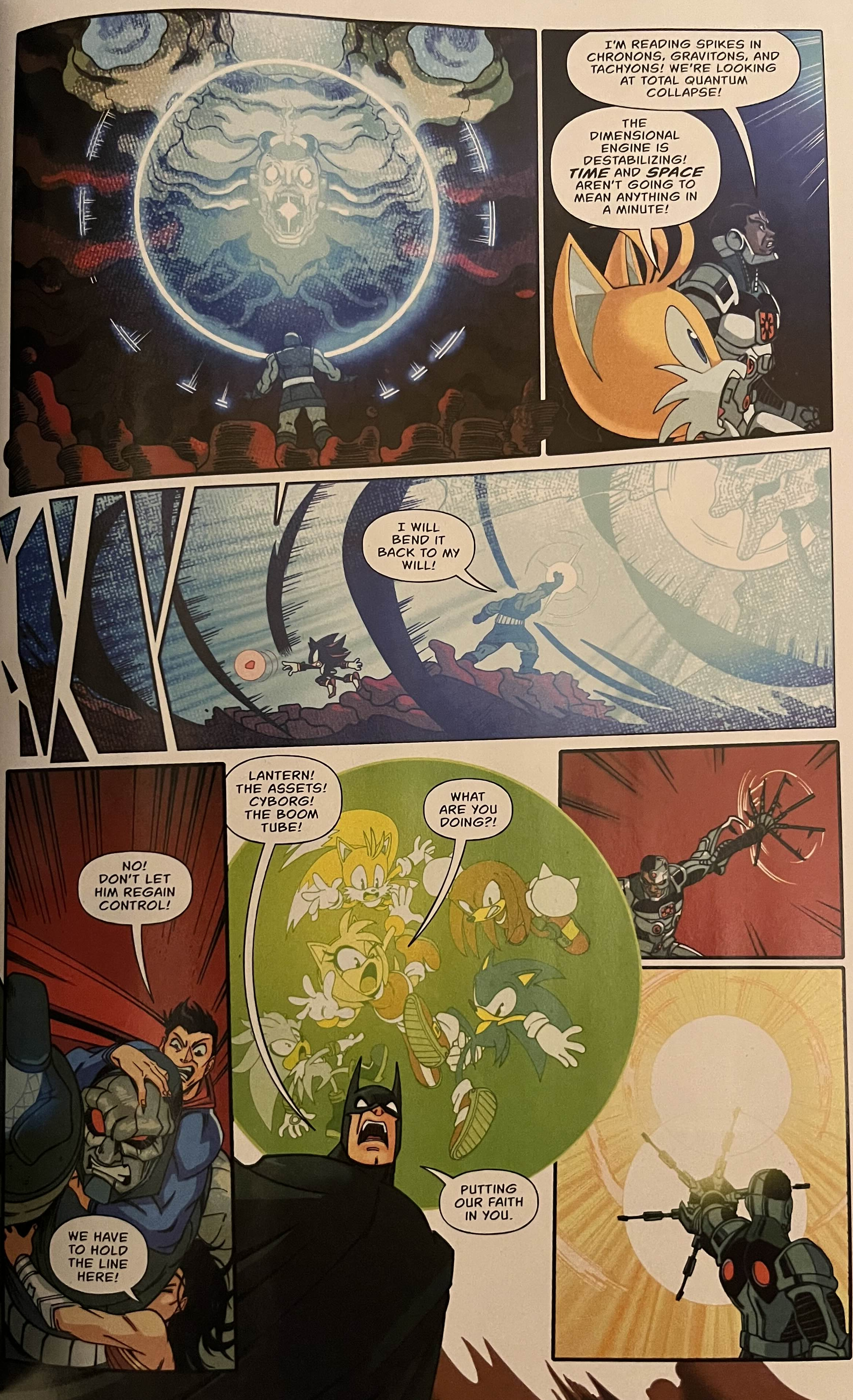 Heck, “Darkseid IS,” could’ve been put in enormous, creepy letters an a full-age spread depicting Darkseid breaking free. The fight thankfully goes on for a few pages. The heroes are struggling to fight back, and Darkseid’s dimensional-hopping face-thing starts going haywire, threatening to tear Sonic’s world apart.