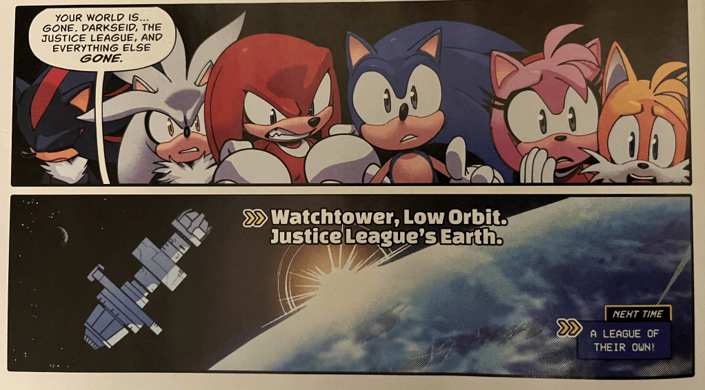As reality crumbles, the Justice League decides to hold Darkseid back while a boom tube from Cyborg and a bubble from Green Lantern force the echidna, fox, and three hedgehogs across universes. Landing them in the Watchtower with Mister Terrific to greet them. They need to returnnand help the Justice League, Amy says, but no, Mister Terriffic’s reply rings cold.